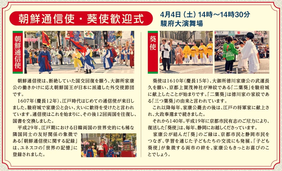 第70回静岡まつりの葵使歓迎式は、4月4日(土)の14:00~駿府大演舞場にて行われます。