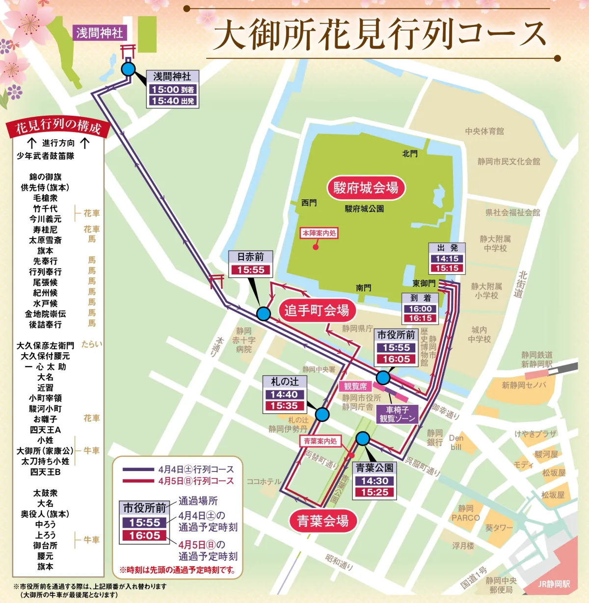 駿府城の大御所様が、御台所や大名たち総勢400名余を引き連れて駿府城下を練り歩きます。 大御所花見行列 4月4日(土)・4月5日(日) Post Share Hatena LINE RSS feedly Pin it note 音楽パレード 前の記事 浅間神社参拝 次の記事