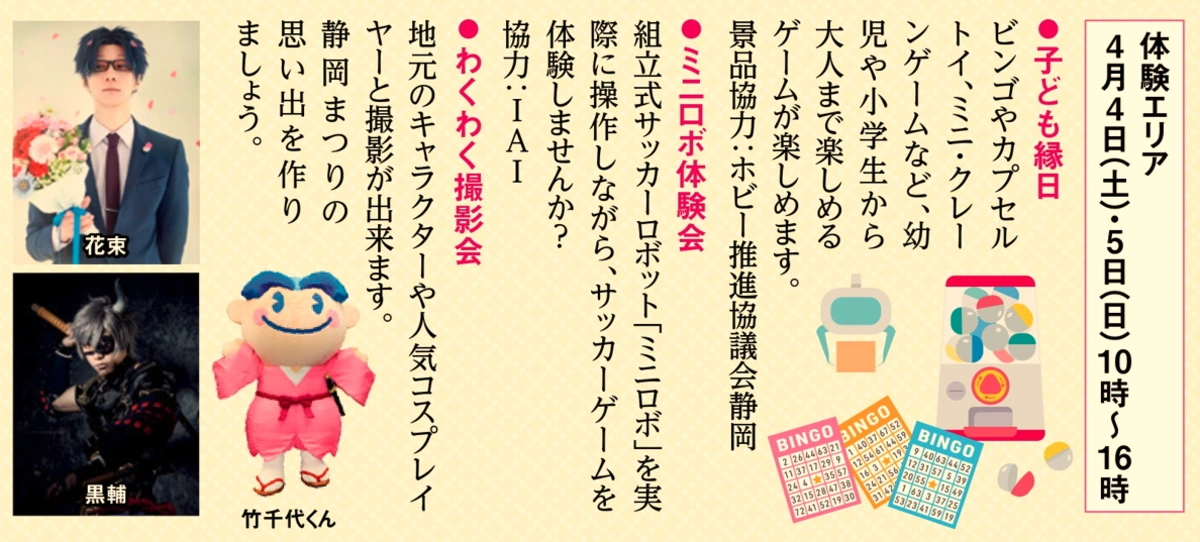 駿府子ども城下町(【1】エリア) 親子で楽しむまつり伝統文化と縁日 駿府子ども城下町 会場:青葉会場【1】エリア 開催日時 駿府まつり塾(体験あり) 4月3日(金)13:00~18:00 4月4日(土)10:00~18:00 4月5日(日)10:00~18:00 城下町の賑を演出する駿府まつり塾。練習で鍛えた「和の大道芸」たっぷりお楽しみください。 風車。コマ・飾り結びの体験ブース有り。 かざぐるま。缶コマは200円(税込)で販売。 「体験エリア」 Post Share Hatena LINE RSS feedly Pin it note 子ども屋台処 前の記事 おだっくい屋台処 次の記事