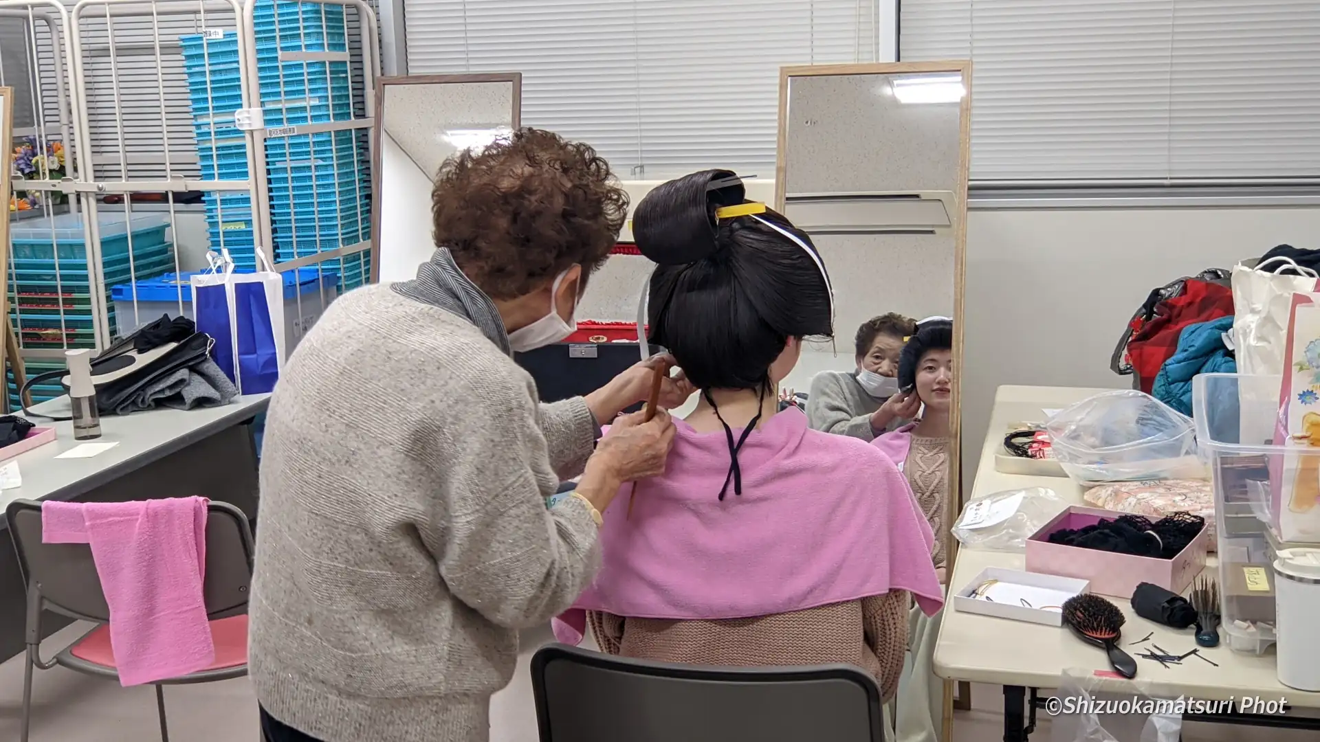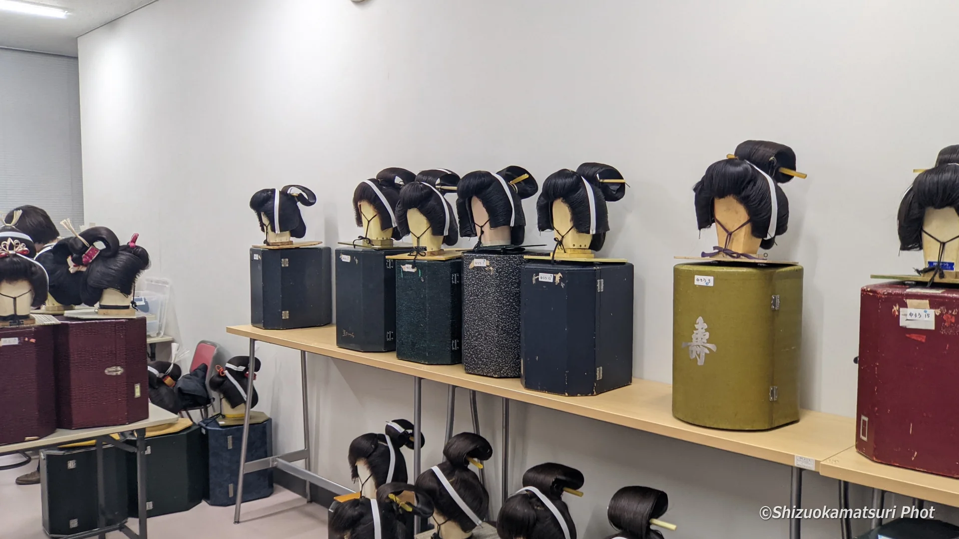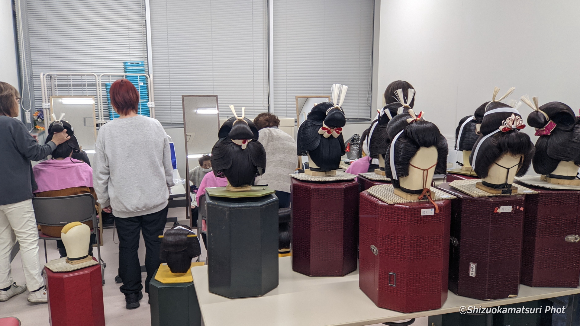 第70回静岡まつり「大御所花見行列」参加者説明会が開催された3月6日(金)、駿河区役所3F会議室での説明会と並行して、同じ階のサークル室では鬘合わせが行われました。
