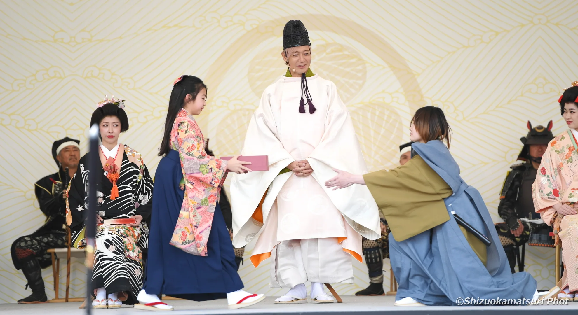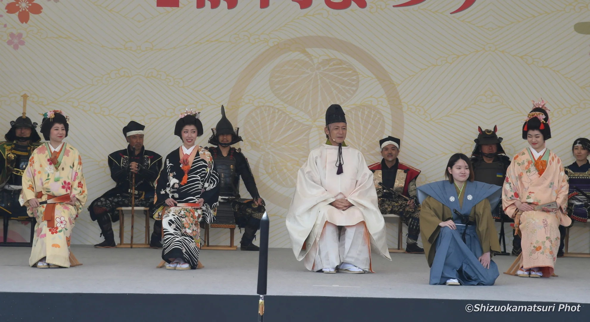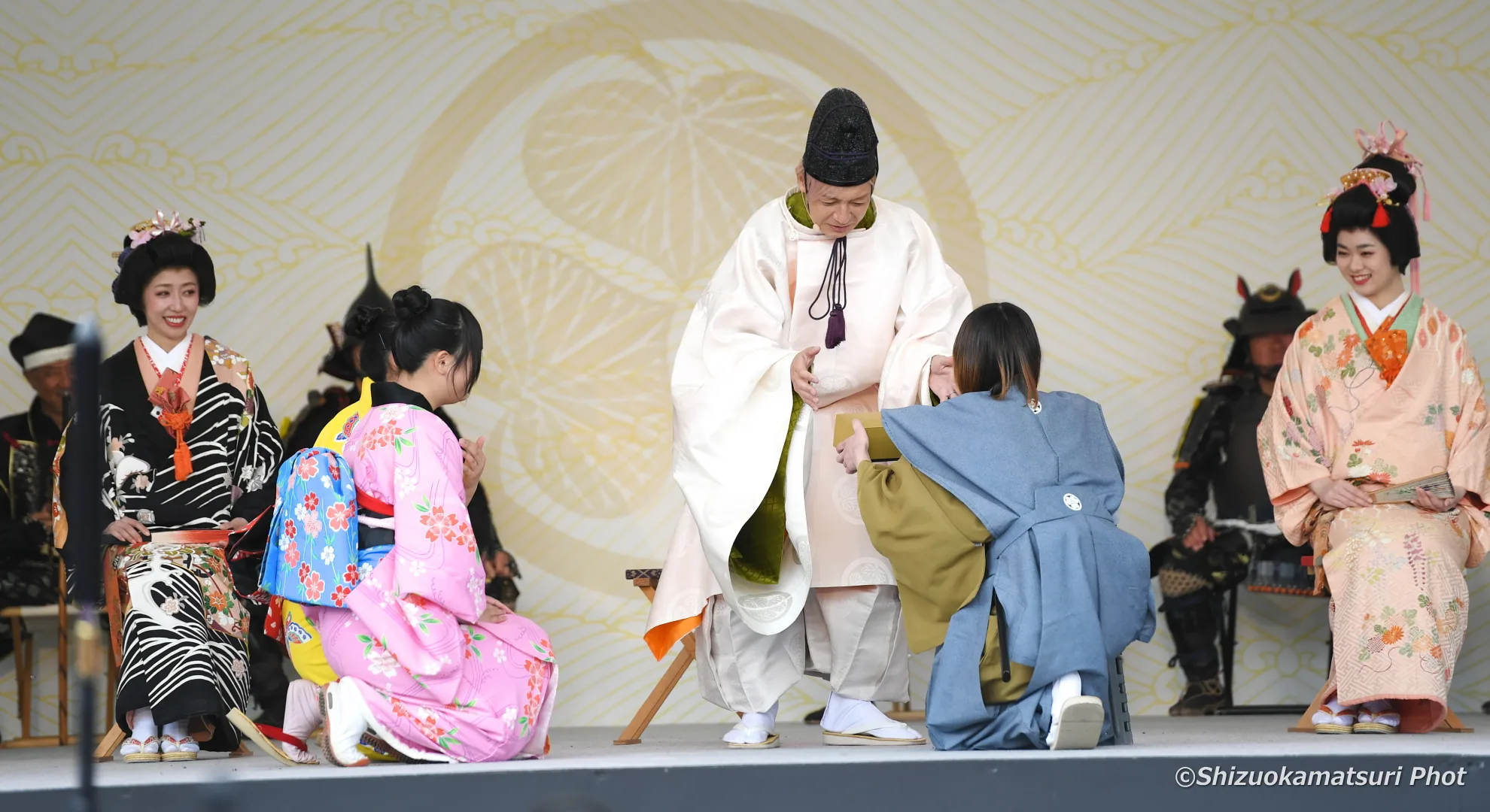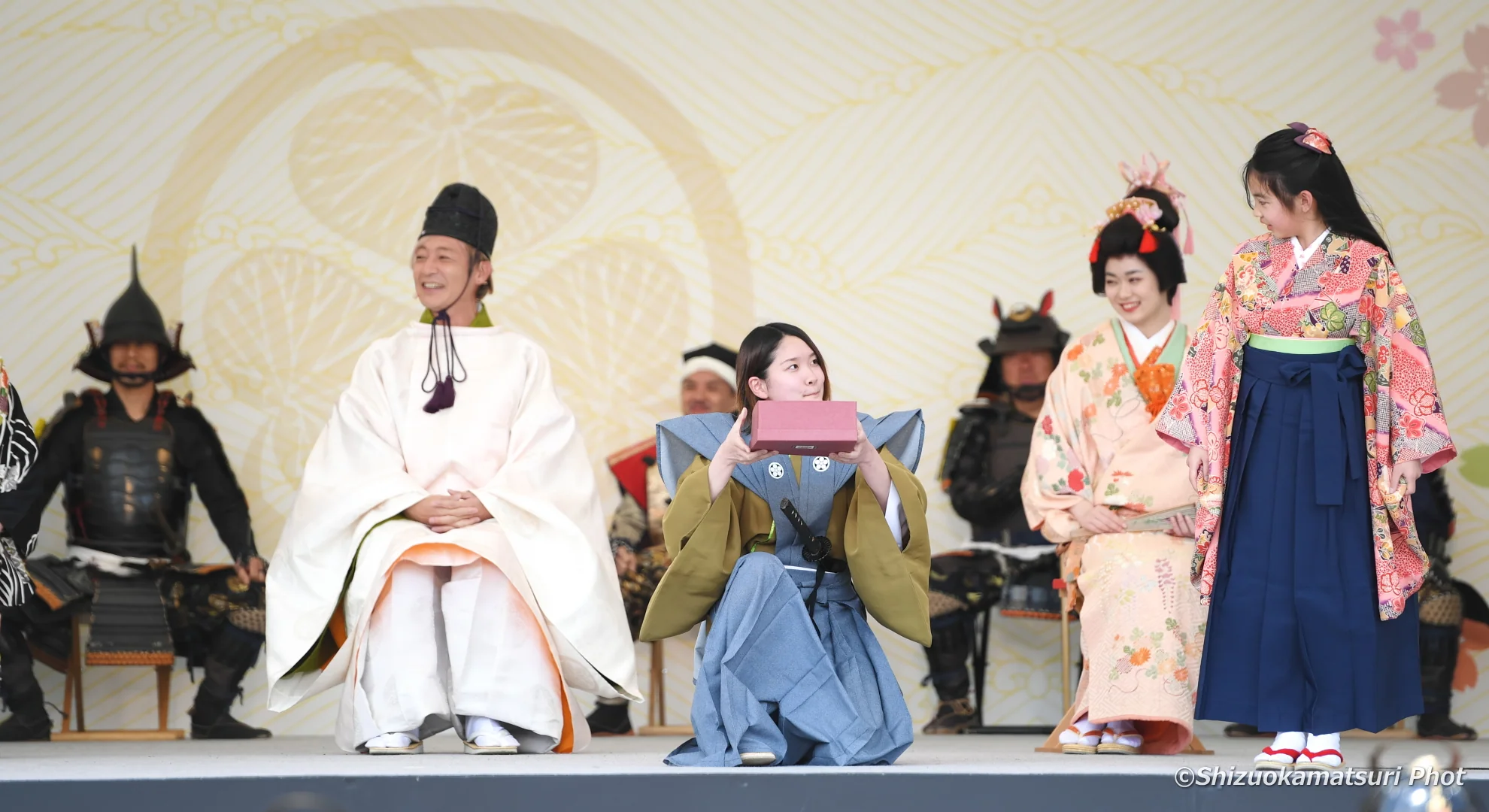 花見の宴を招かれた駿府の町民が、献上品をもって駿府城公園に到着。