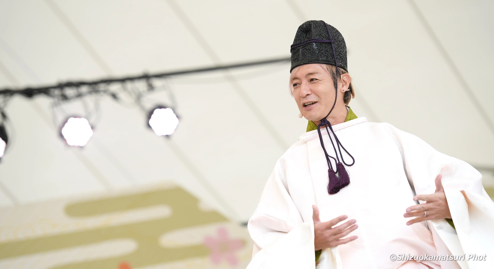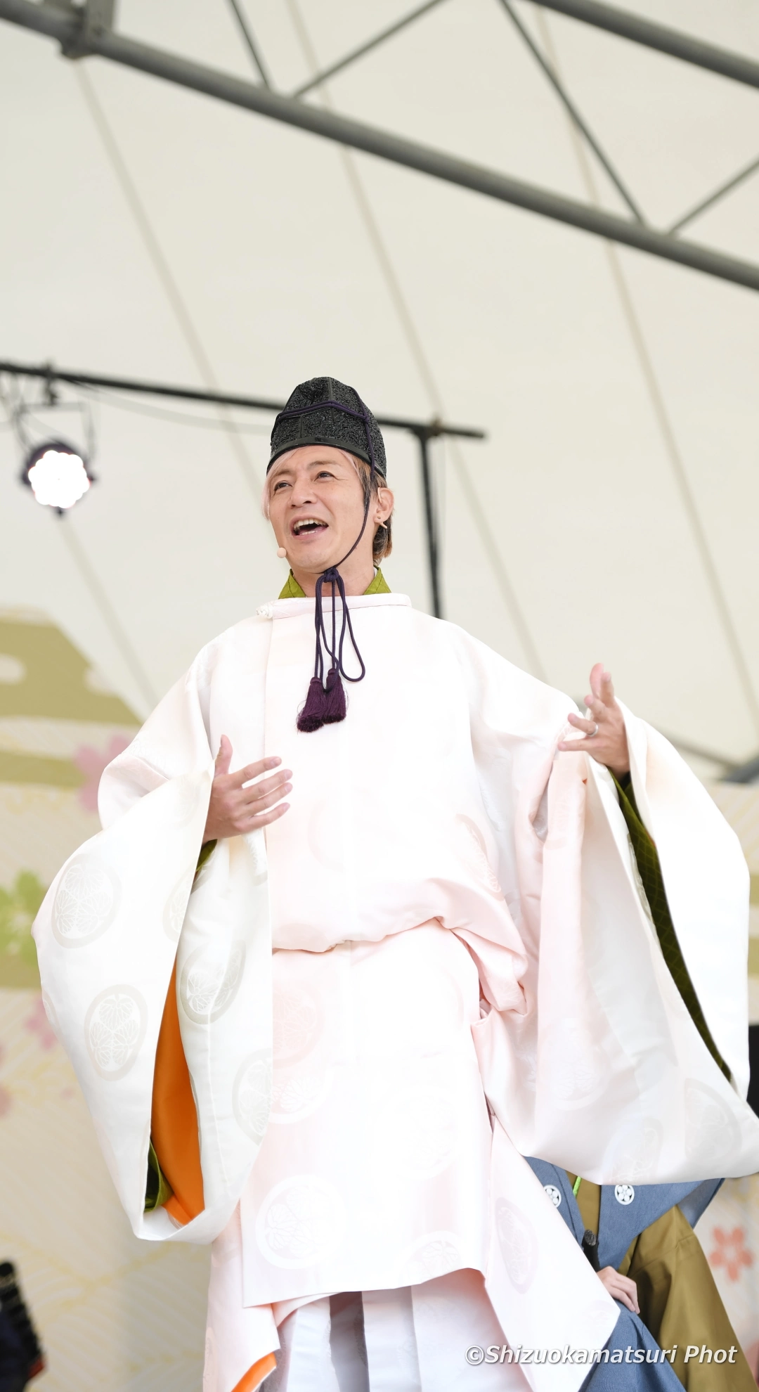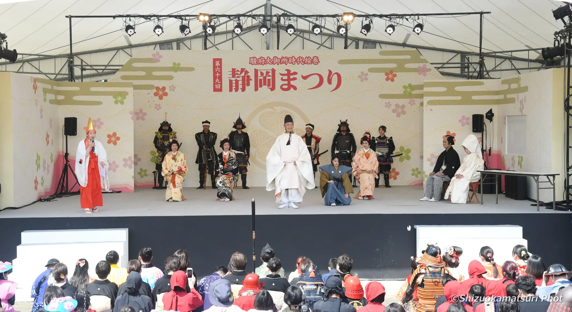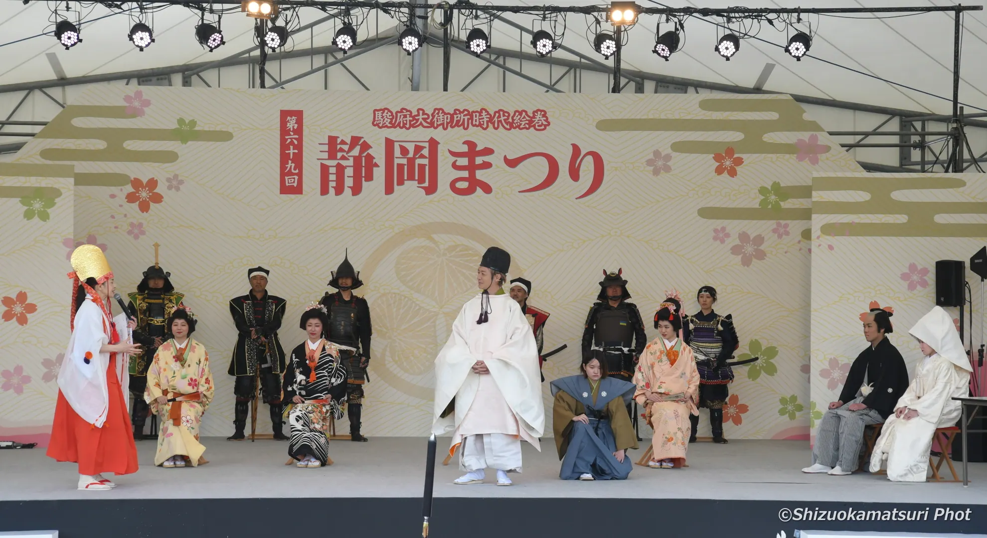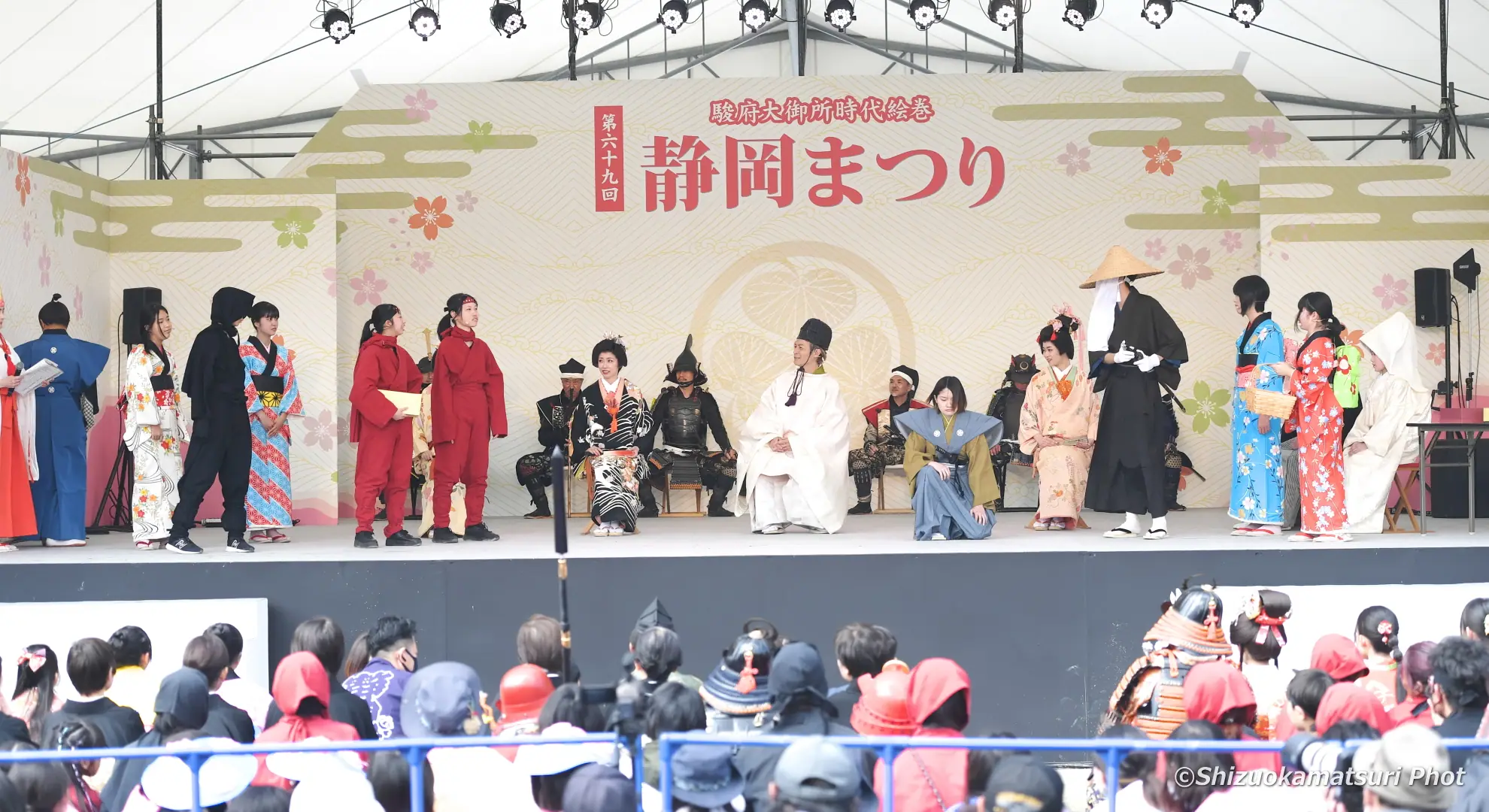 花見の宴を招かれた駿府の町民が、献上品をもって駿府城公園に到着。