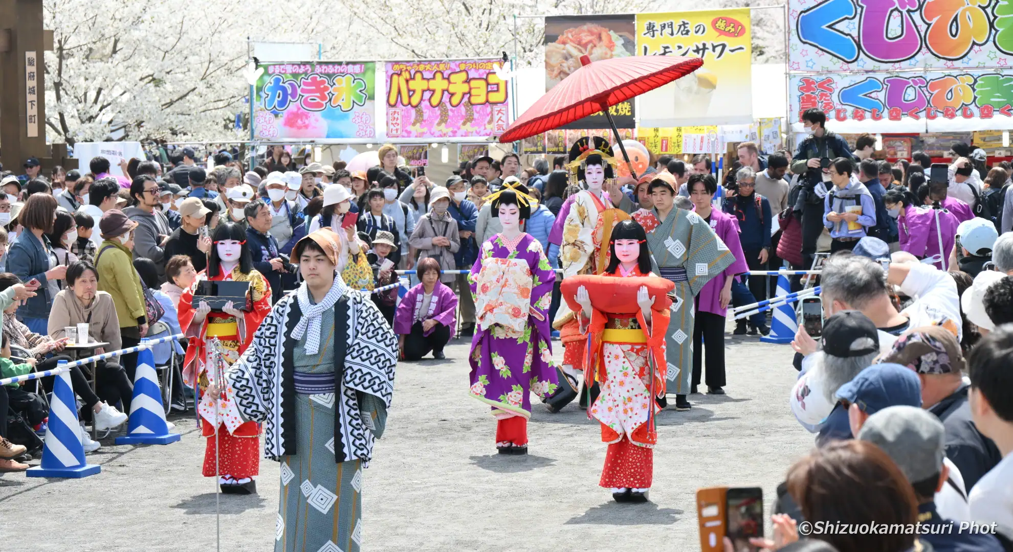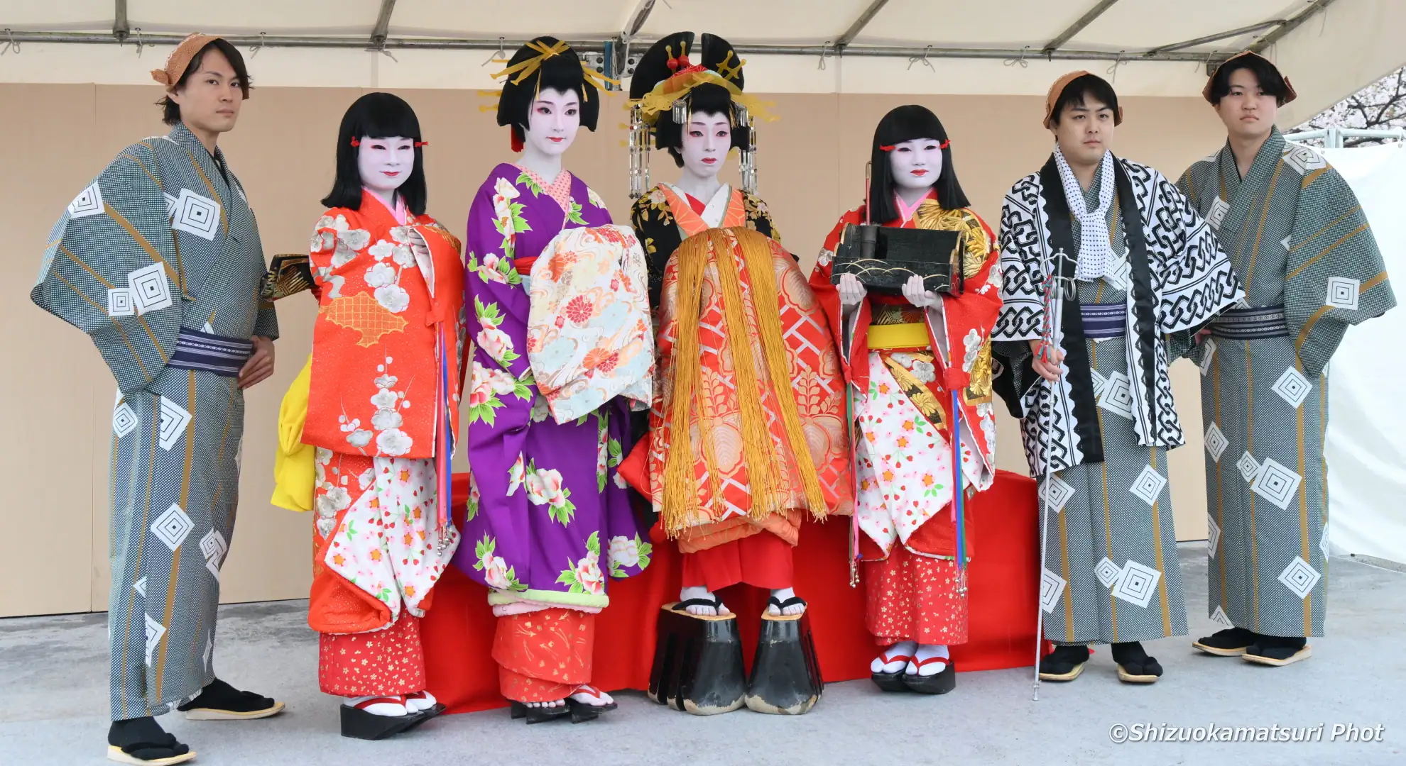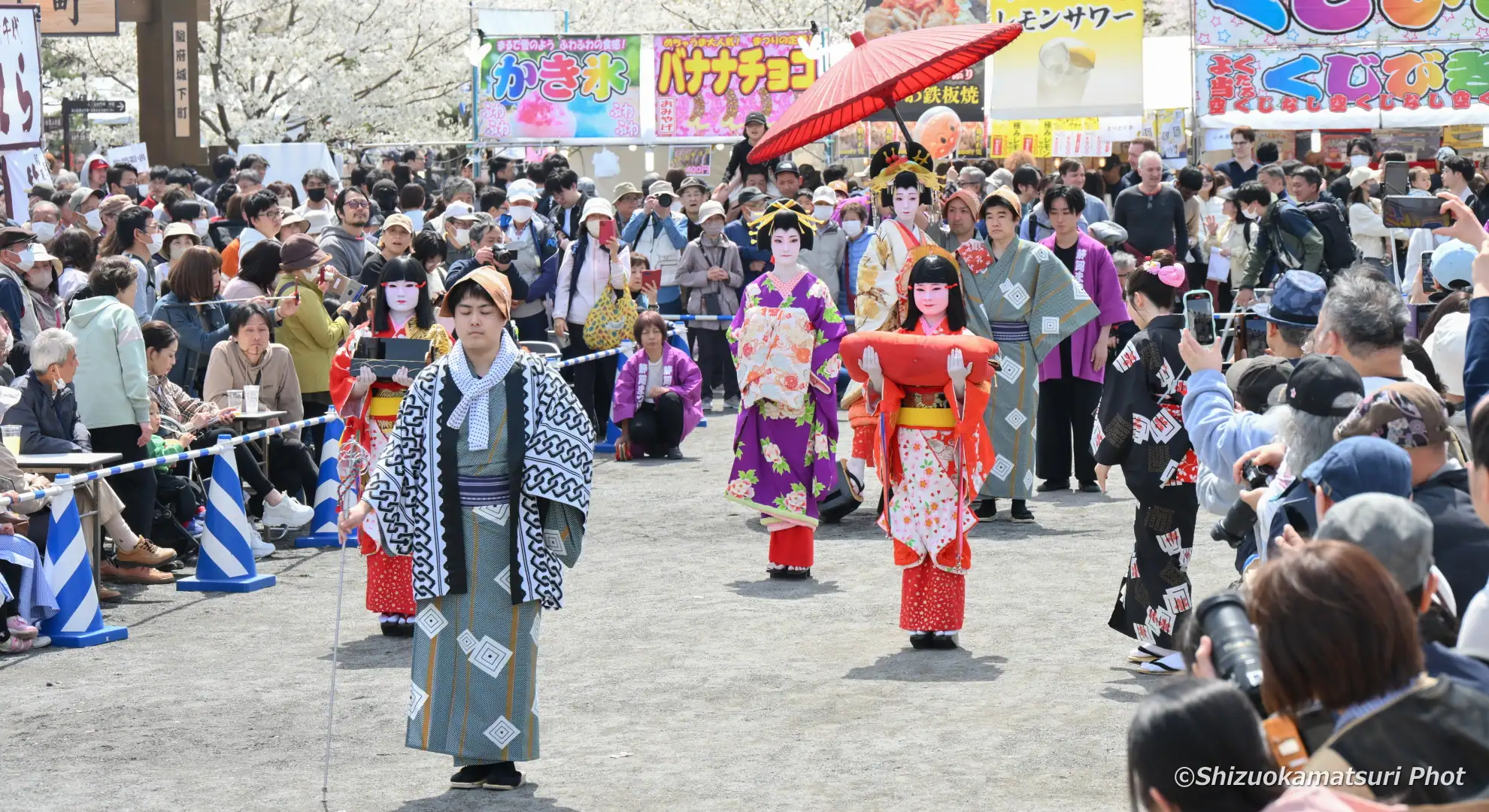 静岡まつりでは、提灯持ち・禿(かむろ)・花魁の見習いの稚児)2名・振袖新造・花魁・肩貸し・傘持ちの7名により絢爛豪華な花魁道中が、駿府城下町をゆる~りゆる~りと練り歩きます。