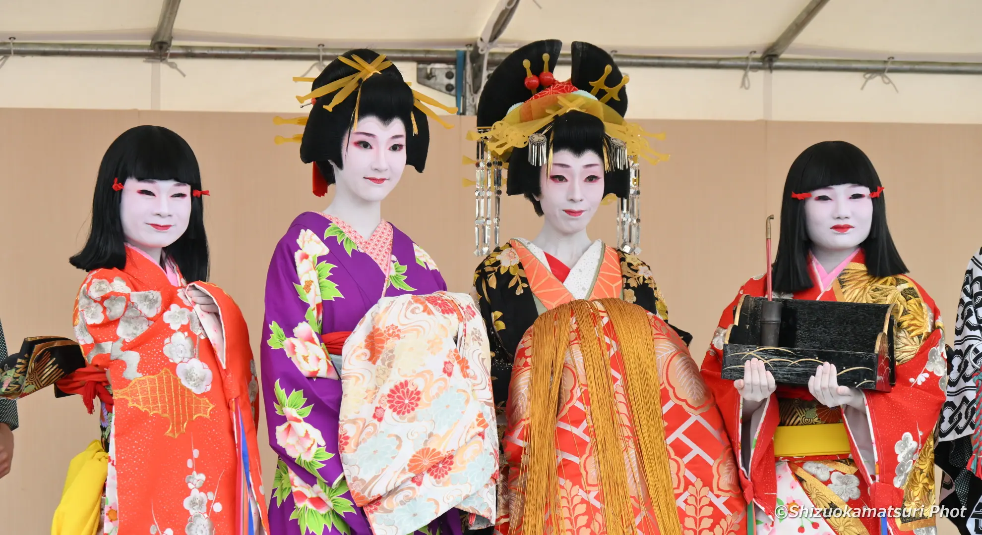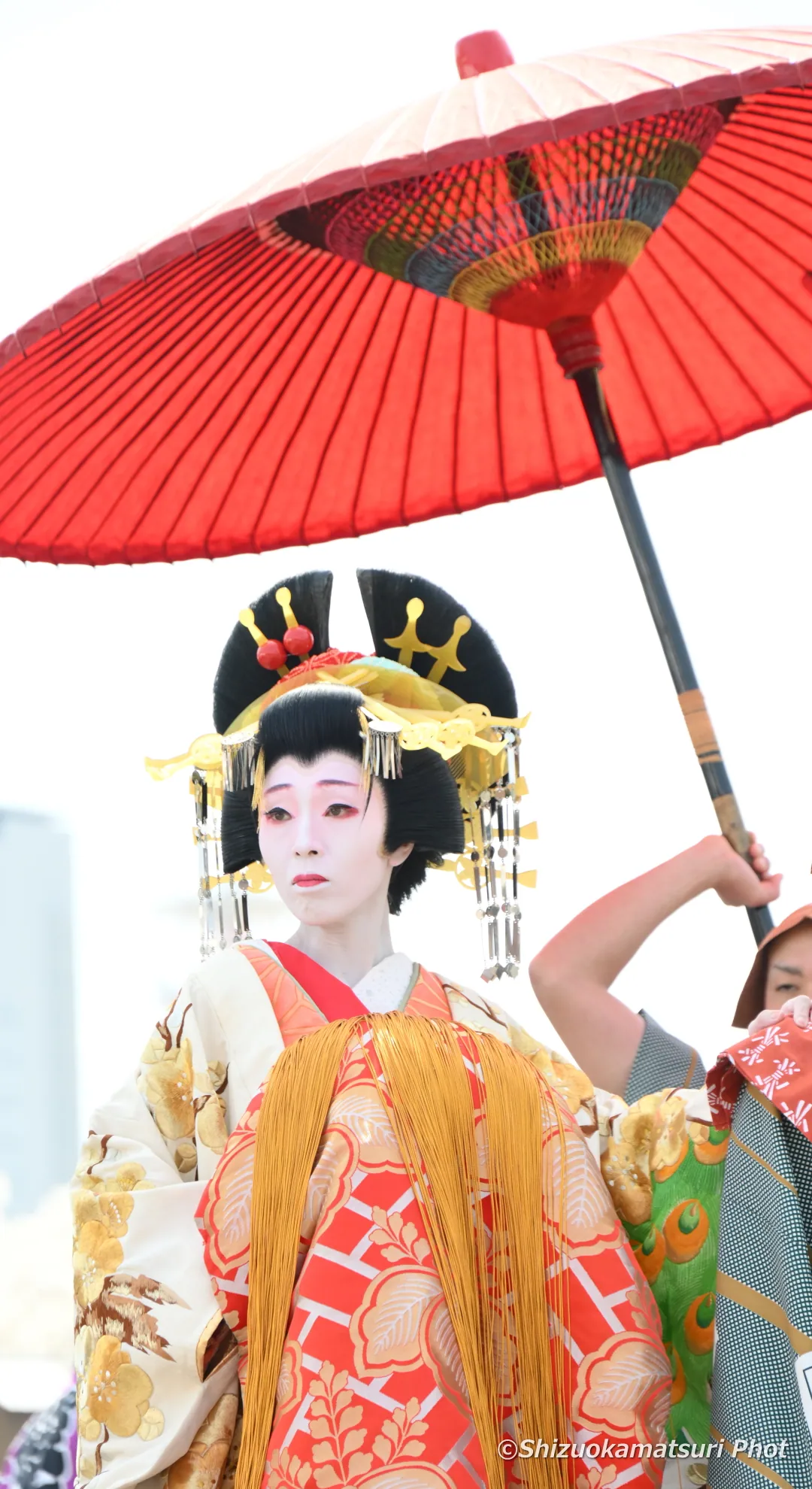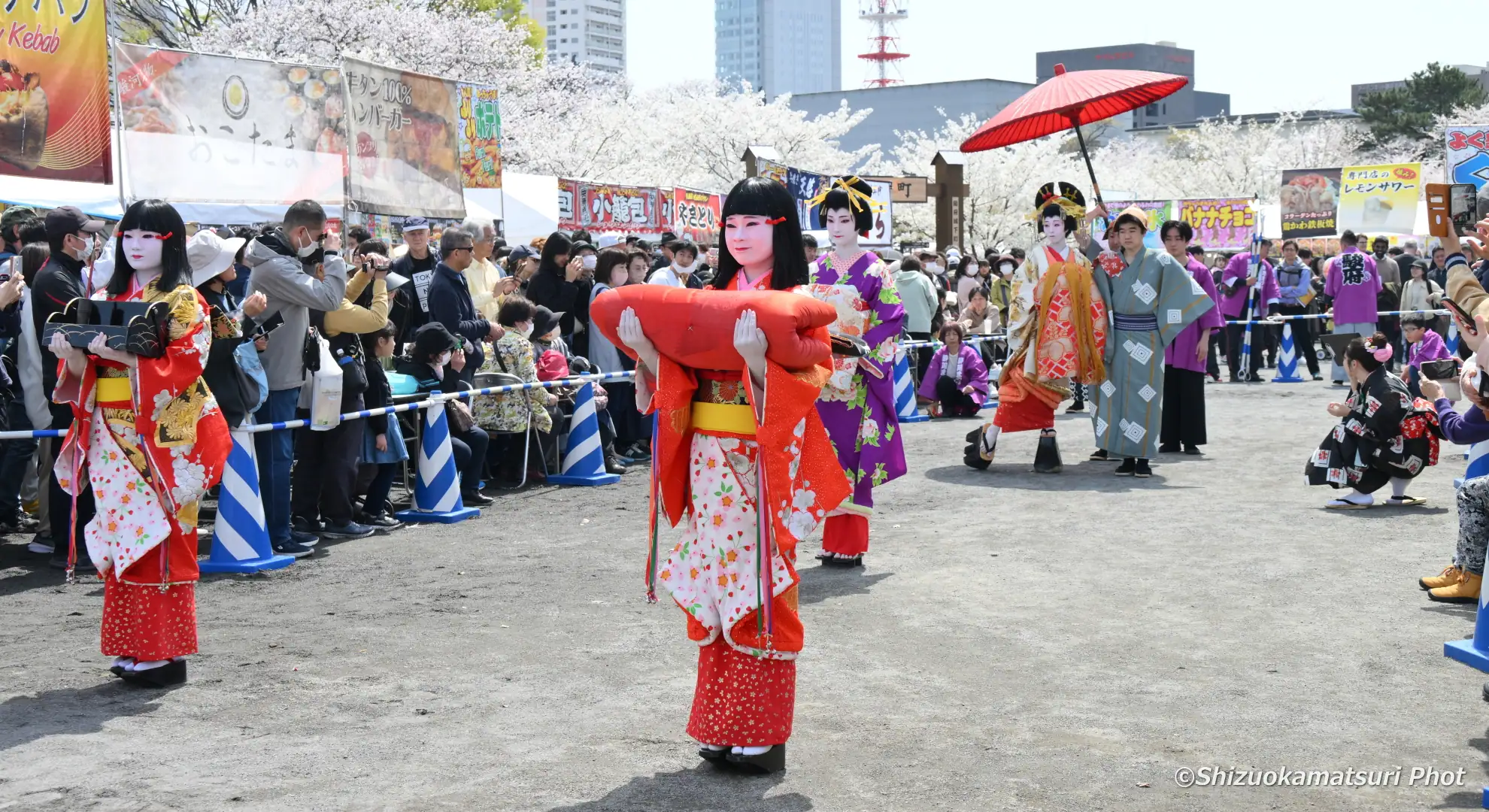 静岡まつりでは、提灯持ち・禿(かむろ)・花魁の見習いの稚児)2名・振袖新造・花魁・肩貸し・傘持ちの7名により絢爛豪華な花魁道中が、駿府城下町をゆる~りゆる~りと練り歩きます。