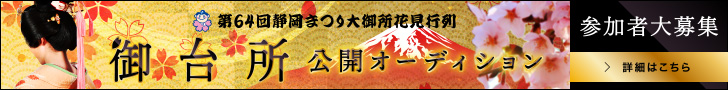 第64回静岡まつりの参加者やボランティアスタッフ等の募集が始まりました。(詳細は各募集ページをご確認ください)■大御所花見行列「御台所・上ろう役」参加者募集! ⇒ こちらから(応募締切:令和2年1月14日)■「大御所花見…
